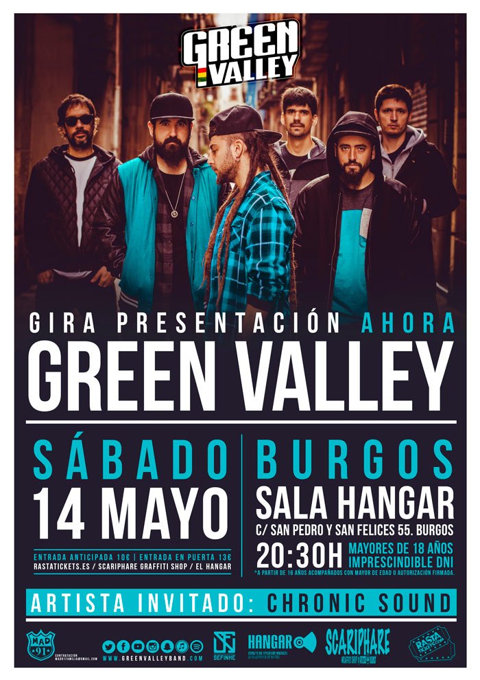 Este sábado 14 de Mayo Green Valley presentarán "AHoRA" en Burgos y como invitados Chronic Sound. Desde las 20:30 horas Sala Hangar c/...