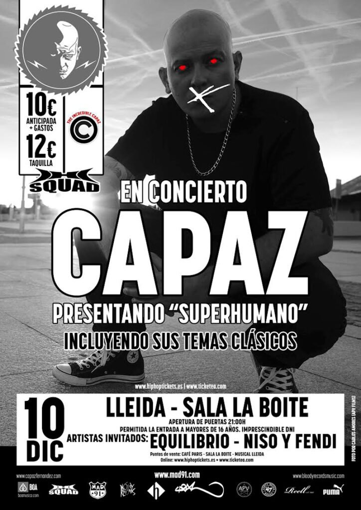 El sábado 10 de diciembre Capaz estará en Lleida presentando "Superhumano" y como invitados Equilibrio y Niso & Fendi. Apertura de...
