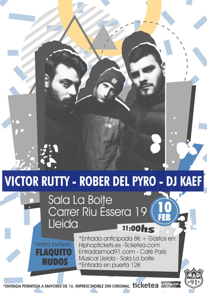 Victor Rutty, Rober del Pyro y Dj Kaef estarán el próximo viernes 10 de Febrero en Lleida junto a Flaquito Nudos. Desde las 21:00 hora...